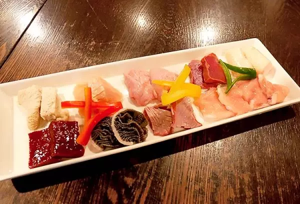 続いての『ホルモンミックス』は、運ばれてきた瞬間、そのカラフルな盛り付けに魅了されるひと品。食感が心地いいハチノスから、なめらかな脂がやみつきになるアカセンまで、日替りの10種が盛られます。とても同じ牛肉とは思えないほど味わいや食感が様々で、焼肉の奥深さが感じられます。