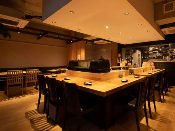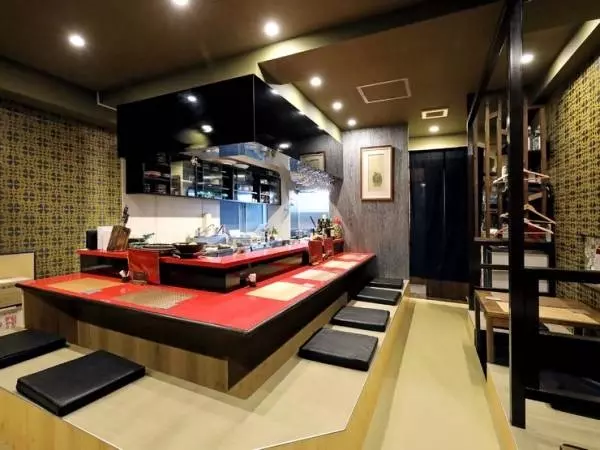 博多駅から徒歩5分、音羽公園近くのビル1階の創作料理店。扉を開けると和を基調としたレトロモダンな空間が広がります。赤を基調とした落ち着いた佇まいのカウンター席や2名用の掘りごたつ席など、デートにぴったりの席を完備。ゆったりとした雰囲気の中で、上質なひとときが過ごせます。