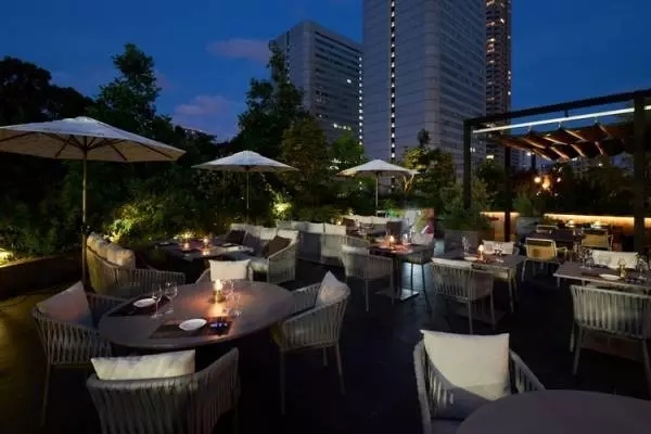 【STELLAR WORKS Restaurant & Bar】の店内奥から続くテラスへ出ると、目の前には赤坂御所を囲む緑が現れ、都心にいることを忘れてしまいそうな開放感を味わえます。さらにその場所には、スペインの高級アウトドア家具KETTAL(ケタル)社のチェアーとテーブルが配され居心地の良さが追求されており、「都会のオアシス」という言葉を自然と連想せずにはいられません。