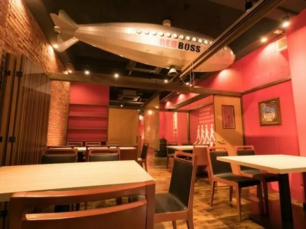 店内は木やレンガで設えられ、温かみのあるポップな雰囲気。天井を見上げると、大きな飛行船が目に飛び込んできます。1F、2Fともに設置されたカウンター席は、一人飲みやデートにオススメ。2Fには10名ほどで使える個室があるので、グループでの来店にぴったりです。吹き抜け階段の、床から天井まで壁面を埋め尽くすワインボトルは圧巻です。