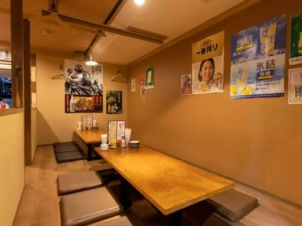 大博通りから博多区役所通りへ入ると見えてくる、店名を記した赤ちょうちんが目印。カジュアルでくつろげる雰囲気に包まれた店内には、気軽にサクッと飲みたい時にちょうどいいカウンター席やテーブル席、掘りごたつ式の座敷席があります。座敷席は少人数の宴会にぴったり。料理と相性抜群の焼酎や日本酒などアルコール類もそろっています。