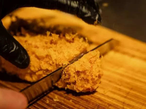 「お肉の味をちゃんと味わってほしいので、パン粉の味は控えめながら、香ばしくサクサクの食感になるものをとパン粉専門店からパンの糖度、挽き方などを変えて何種類も見本を届けてもらって決めました」とパン粉も徹底的にこだわっています。