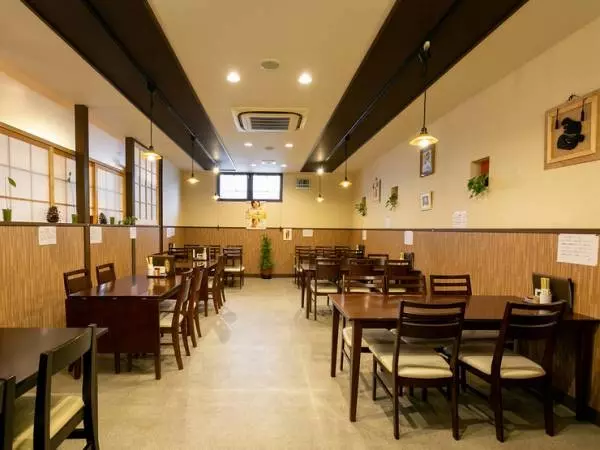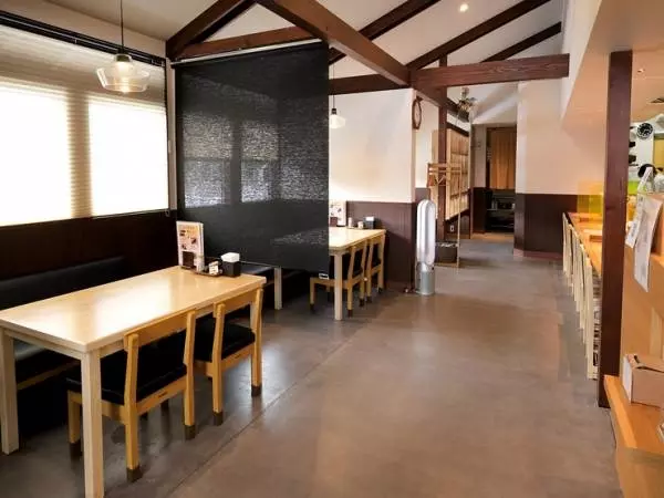 閑静な住宅地にあるお店は、店名の書かれた看板が目印。駐車場を完備しているので、ドライブ途中に立ち寄りやすいのもうれしいところ。店内にはテーブル席と座敷席が用意されていて、座敷席は個室としても利用可能。少人数からファミリー、グループまで、使いやすいつくりになっています。