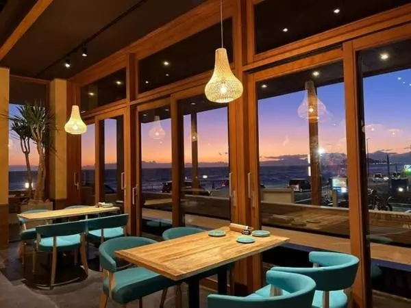 お店がある稲村ケ崎は、江の島の背後に沈む夕日と富士山を楽しむことができる絶景スポット。ロマンチックなデートをするのにうってつけのシチュエーションです。すべての席から海が見えるように設計された店内から、暮れなずむ空と海のグラデーションを楽しみましょう。テラス席から眺める青空と青い海も素敵です。