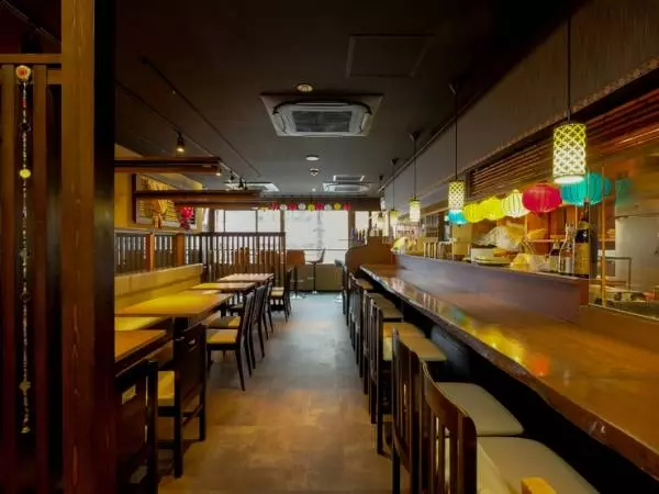 店内はブラウンを基調に、アジアンテイストにまとめられています。赤や青、黄色のカラフルな提灯が飾られ、まるでアジアの夜市にいるような雰囲気。ベトナムビール『333(バーバーバー)』や、サトウキビ蒸留酒がベースのカクテル『カイピリーニャ』などアジアのお酒を傾ければ、プチ旅行気分が味わえます。
