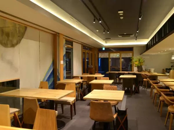 京橋、八重洲、日本橋にも近い便利な立地で、街並みが楽しめるガラス張りのフロアはとってもスタイリッシュ。白壁に石州和紙のタペストリーが揺らめく店内には、白木の質感を活かしたテーブル&チェア、モダンなインテリアが配されて心落ち着く雰囲気に。1名席も用意されているので、気軽に立ち寄れるのも魅力です。