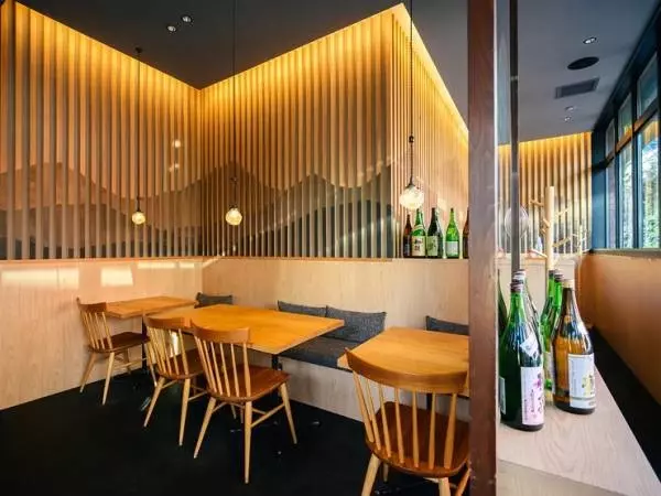 洗練された店内は、従来の“蕎麦処”のイメージとは一線を隔すモダンさ。座席は多彩で、人数やシーンに応じてチョイス可能です。山形の地酒にもこだわり、季節ごとのオススメを常に8~10種ほどピックアップ。郷土料理とともにじっくりと杯を重ねることも。山形の工芸品やお土産をそろえたコーナーのチェックも忘れずに。