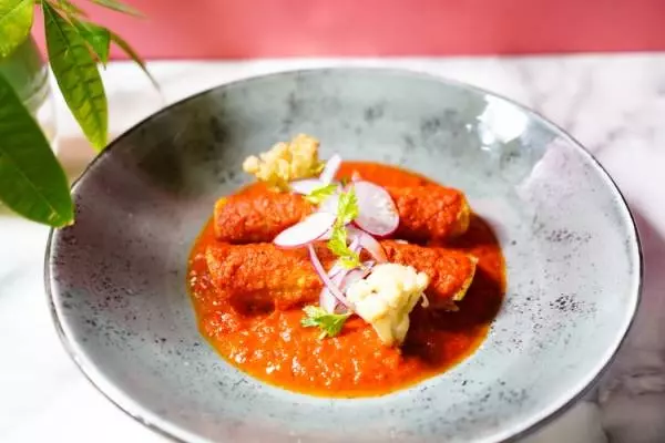 メキシカンの定番エンチラーダス。トルティーヤの中にはジューシーな佐賀県産ありたどりをロールしてあります。ローストした玉ねぎとトマト、ハバネロをベースにしたランチェラソースが香ばしいトルティーヤの上にかかることで生まれる触感と香りのコントラストを楽しんで。