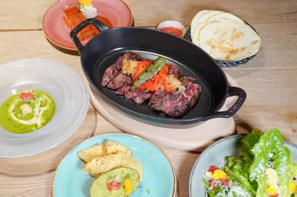 USスカートのシズリングファヒータをはじめ、特製ワカモレ・シーザーサラダや季節のスープを堪能できるコース。