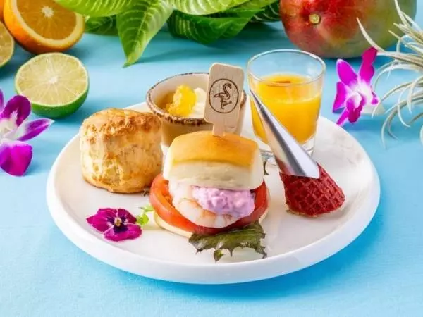 ライムの皮で香りをつけたパインを煮詰めた自家製ジャムと、コク深いクロテッドクリームを添えていただくホテルメイドの『プレーンスコーン(パイン&ライムジャムクロテッドクリームと一緒に)』をはじめ、フラミンゴの串が愛らしい『海老としば漬けタルタルのミルクパンバーガー』、アボカドクリームを詰めたピンク色の『アボカドクリームのビーツコーン クルミとアーモンド』、カリカリ生ハムが彩る冷たい『カリカリ生ハムを浮かべたパイナップルのスープ』。