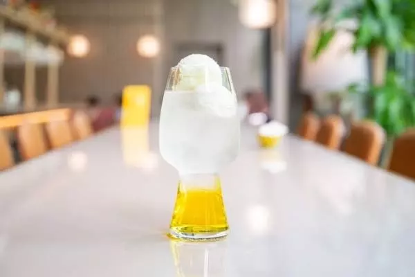 1,400円(税金、サービス料込)。大阪・能勢町産のメロンシロップ、大阪サイダー、能勢のソーダを組み合わせた黄色いメロンソーダに、クリーミーなバニラアイスをトッピング。