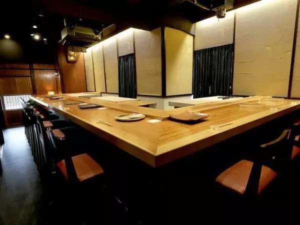一枚板でつくられたカウンターが目を引く、上質な雰囲気の店内。壁の古時計がレトロな雰囲気を演出し、心がほっと和みます。大将が握る姿をカウンター席で眺めつつ食事をするのもよし、テーブル席で大切な人と向き合いながらお寿司を味わうのもよし。大人のデートにも、接待や会食にも使える頼れる寿司店です。