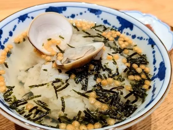 パカっと開いた大ぶりのはまぐりから、素材の旨みが染み渡る出汁茶漬け。国産のはまぐりの流通が10%と言われている中、素材にこだわり千葉県産天然活はまぐりを使用。貝本来の旨みと風味をまるごと味わえます。また、だしは国内製造のかつお節、さば節、そうだがつお節の混合だしと北海道産の昆布だしをあわせた上品な風味となっており、そこにはまぐりの旨みが重なった一品。