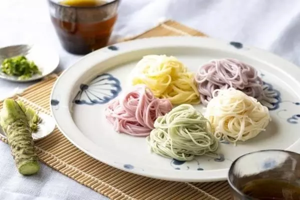 彩りと味にこだわり、野菜や果物をそのまま粉末にして小麦粉に練りこむことで、色と風味を加えた五感で味わえるそうめん。乳白色のそうめんに、しその葉、梅、紫芋、かぼすなど自然が育んだ色素材を練り込み、五味五色のそうめんに仕上がっています。