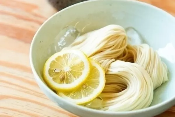 瀬戸内海に浮かぶ香川県小豆島で50年続く「石井製麺所」が作る昔ながらの天日干し手延べ製法。職人の技術、勘、経験が組み合わさり、はじめて喉ごしの良いこだわりの素麺が出来上がります。そのこだわりの素麺に、瀬戸内レモンの果皮が練りこまれています。無添加、無着色で小麦本来の風味の中にさわやかなレモンの香りを感じられます。