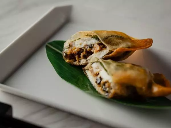 『鮎の春巻』は6600円コースの一品。九州日田市から取り寄せた鮎は3枚におろし、間にピータンなどを挟んで揚げている