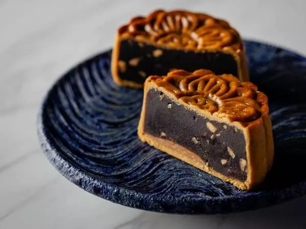 お客様の要望で作り始めた月餅1個660円。要予約。小豆餡と砕いた飴がけのくるみ入り
