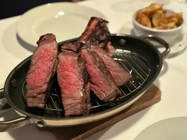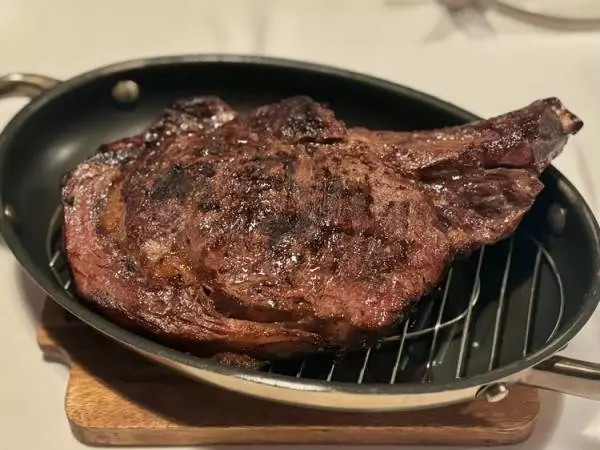 ここでメインディッシュ『ドライエイジング アンガスビーフ 骨付きリブアイ』の登場です。まずこのボリュームにびっくり!これで2人前です。食べられるか心配になるほどですが、脂が少なく赤身肉とは思えないほど肉質が柔らか。熟成により旨みも凝縮され、ついつい食べ進めてサラッと平らげてしまいました。