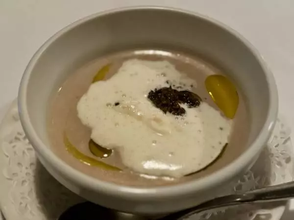 続いて濃厚なポタージュスープ。マッシュルームの旨みが凝縮されたクリーミーなスープで、トリュフの上品な香りが鼻腔を満たします。ほどよい塩味も相まって五臓六腑に染み渡るおいしさ。フレンチに来たのかと錯覚するほどの仕上がりです。