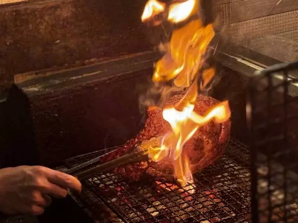 メインのアンガスビーフを豪快に炭火焼きする様子。特別に見せていただきました