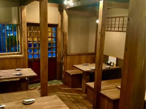 お店はエントランスに掲げられた大きな木製の看板が目印。店内は木のぬくもりが感じられる空間になっていて、1階はお一人様やカップルにオススメのカウンター席とグループで使えるテーブル席、2階には座敷席を用意。2階は人数に応じて、個室として利用することもできます。