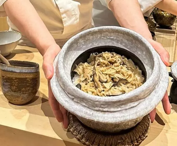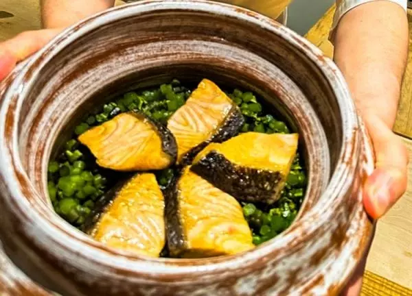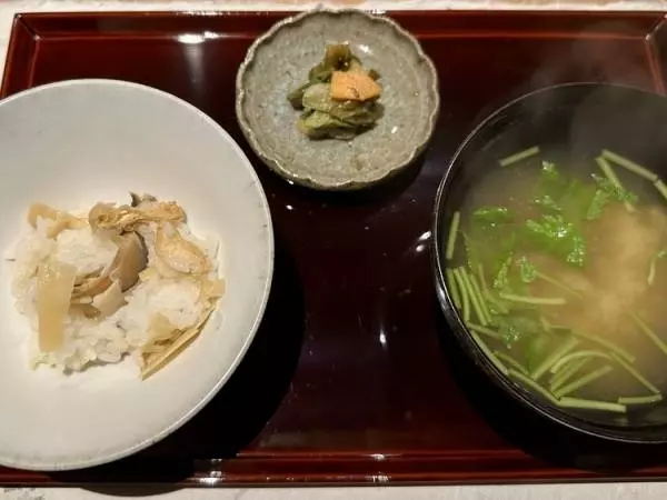 最後は出羽屋さんご自慢の混ぜご飯です。山菜とサクラマスの2つが出てきました。月山の湧き水で炊きあげられたいい香りの白飯に季節の山菜が混ぜられます。炊き込みではなく混ぜるというところにもこだわりがあると佐藤さんは言います。
