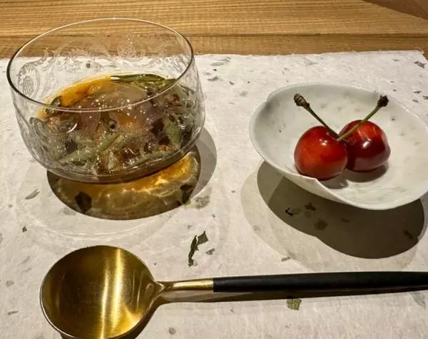 最後の甘味は目の前で佐藤さんがつくる葛切り。じゅんさいと黒蜜でいただきます。山形のサクランボも旬を迎えました。