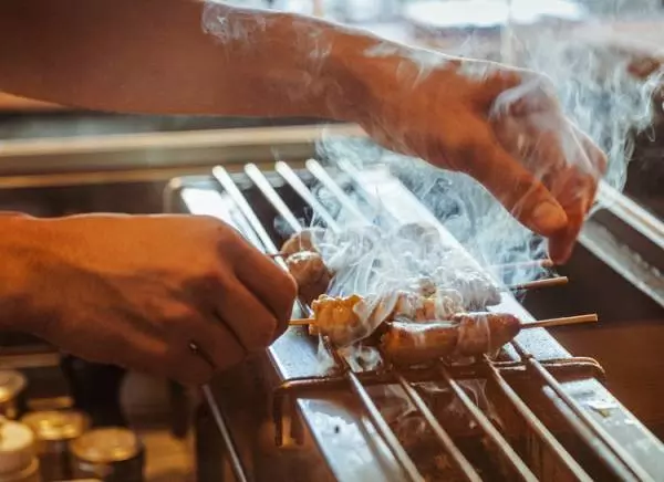 焼き始めると串を覆うほどの煙が上がり、炭火ならではの香ばしさをもたらす