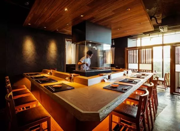 落ち着いたインテリアにカウンターとテーブル席、個室を設けた空間