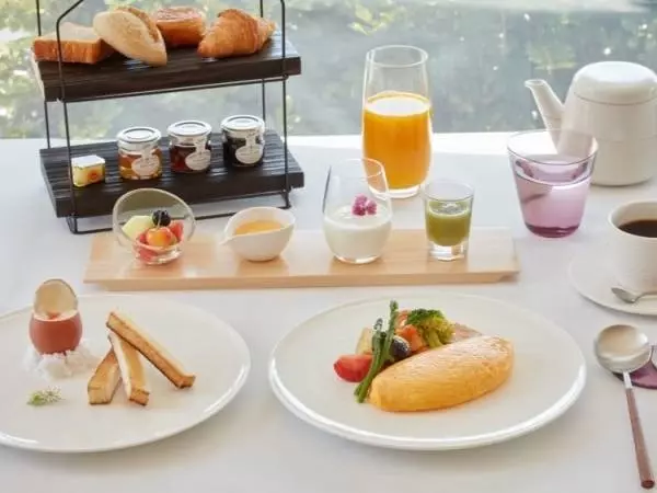 「ザ・キタノホテル東京にとって、ご朝⾷こそ、ご宿泊の体験のイメージを⼤きく印象付けるもの、そしてお客様のご体調を左右するもの」という信念の元、宿泊したゲストのみに提供される朝食にも、レストランのこだわりが光ります。和と洋の2種類から選べ、そのどちらにも自家製キタノヨーグルト、スムージー、コンポーテが添えられており、朝⼀番の⾝体に染み渡るような、素材の⼒を感じられる朝⾷です。