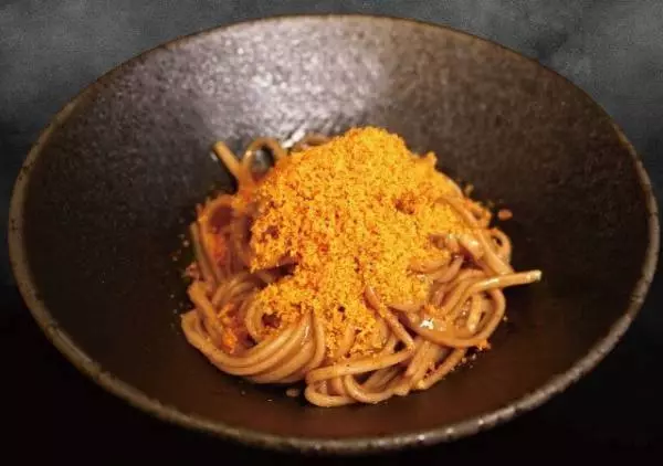 700円。【鮨 銀座おのでら 総本店】括総料理長・坂上 暁史氏直伝の珍味「本店仕込みからすみ」を、贅沢に蕎麦にトッピング。一般的なからすみと異なり、こちらはボラの卵巣を味噌漬けにすることで、より重厚な味わいを楽しめます
