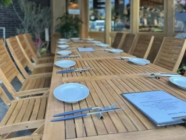 オープンテラスで魚介料理とワインを