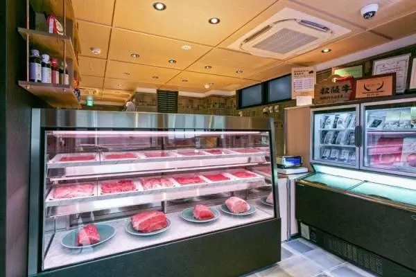 1階は精肉店として今まで同様、黒毛和牛の雌の品質にこだわり、生産者が日々手塩にかけて飼育した牛を最高な状態の牛肉として販売。旧店舗同様、昔ながらの水冷式の冷蔵庫にこだわり、さらに店の外から骨付き肉を眺めることができる追熟用の冷蔵ショーケースも設置しています。