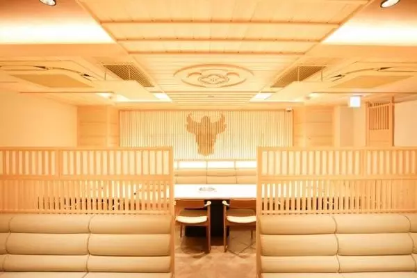 2階の肉処は5卓20席。やわらかい光に囲われた檜の格子が美しい空間です