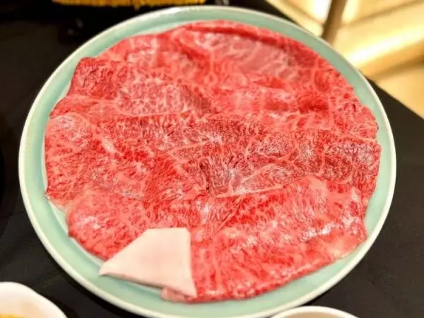 「すき焼きコース」では、岡崎牧場の「完熟近江牛」をいただきました。「完熟近江牛」とはじっくりと年月をかけオリジナル配合の濃厚飼料に移行する方法で、通常の牛が24か月~で出荷されるのに対し、岡崎牧場では36か月以上の長期肥育を行っています。そうすることで、肉質の旨みが最も高まるタイミングで出荷されるそうです。
