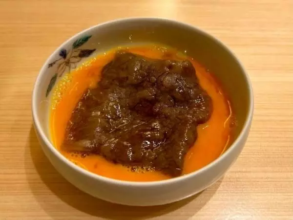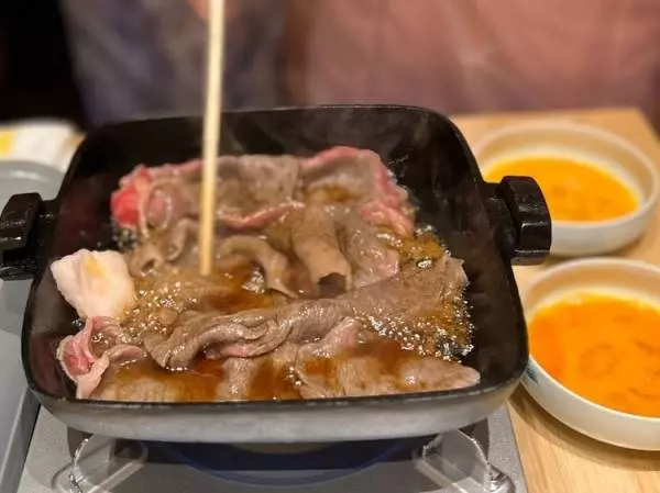 肉は関西風に、鉄鍋でしっかりと焼きます。割り下は関東風を取り入れ、群馬の「正田醤油」の割り下を使用した、関西風と関東風をミックスしたハイブリットなすき焼きです。この日いただいた近江牛のロースは、肉質がとてもやわらかく、口の中でとろけるほど。