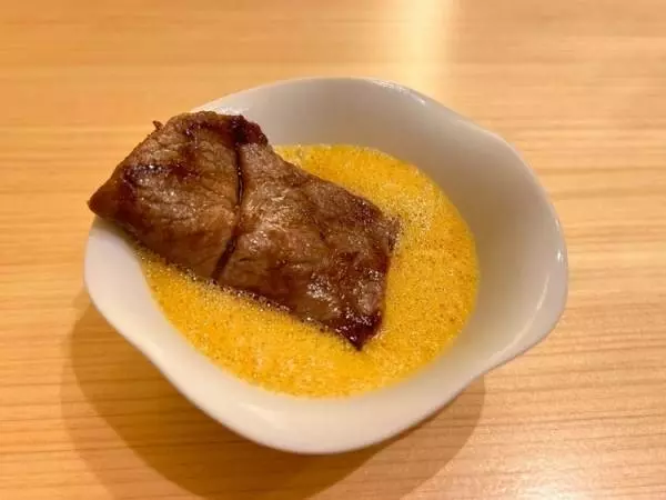 岡崎牧場の「近江牛 ミスジ」(43か月)は、たまごダレでいただきます。このたまごダレは割り下をベースに卵を撹拌することで、生の卵と異なるふわっとした質感に。卵が肉によく絡みます。