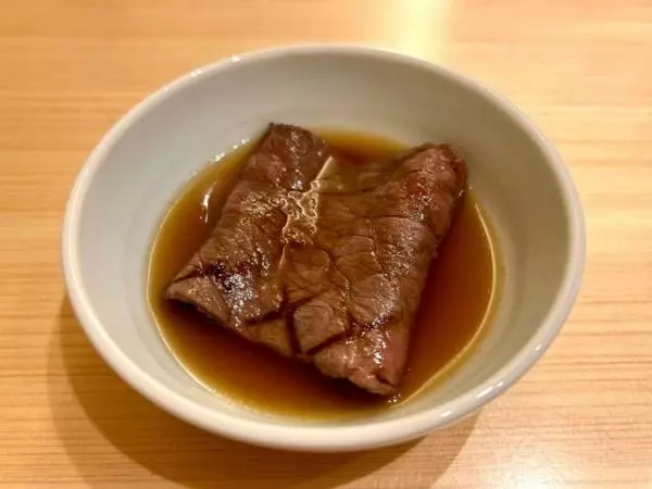 堀坂牧場の「松阪牛 肩三角」(32か月)は、つけダレでいただきます。このつけダレには特徴があり、和の柑橘が加えられているため、最初の一口目はさっぱりとした味わい。そして、コースが進むにつれて肉の旨みが染み込み、味わいが変化していく=“タレを育てる”楽しさも堪能できます。