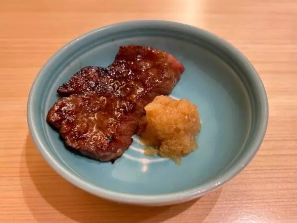 おろしダレとつけダレでいただく、堀坂牧場の「松阪牛 カイノミ」(32か月)。肉の旨みがしっかりと感じられますが、おろしダレと合わせているので後味はさっぱり。