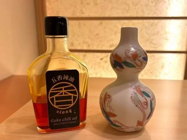 味変のために用意された「リンゴ酢」と八角入りの「ラー油」