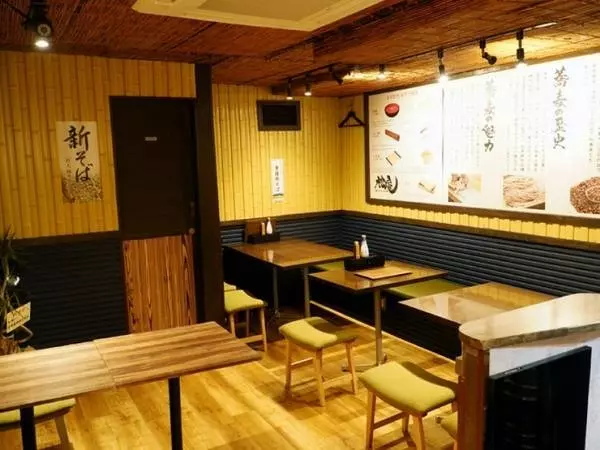 大きく店名の書かれた看板と暖簾が目印。外からも蕎麦打ちの様子を見ることができ、職人の見事な手さばきに期待が高まります。落ち着いた雰囲気の店内には、カウンター席とテーブル席を用意。テーブル席は移動させることも可能なので、5名以上のグループでも対応可能です。街中にありながら、ゆったり過ごせる和の空間。デートにも、少人数の飲み会にもオススメです。