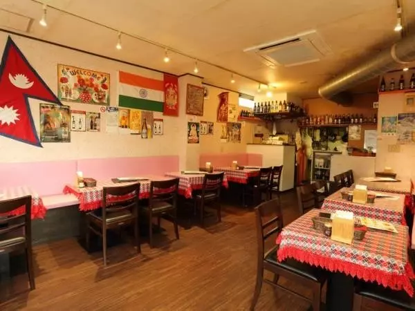 壁に飾られたネパールやインドの国旗が目を引く店内