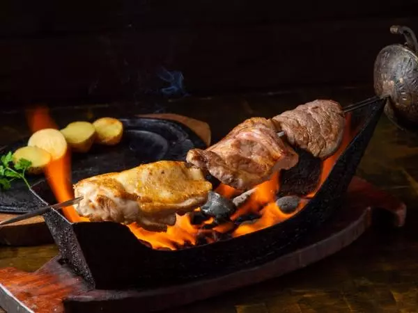 ゲストの目の前で炙って仕上げる『炎の短剣焼き』(写真は『ミックス肉の短剣焼き』)