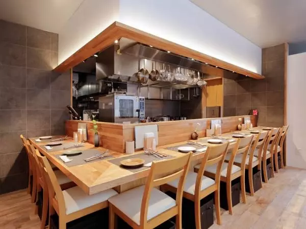 お店はワインのボトルがデザインされた黄色い暖簾が目印。店内はシンプルにまとめられていて、L字型のカウンター席では、調理の様子を見ながら食事を楽しむことができるほか、プライベート感のある半個室も完備。リラックスできる大人の空間でくつろぎの時間を過ごせます。