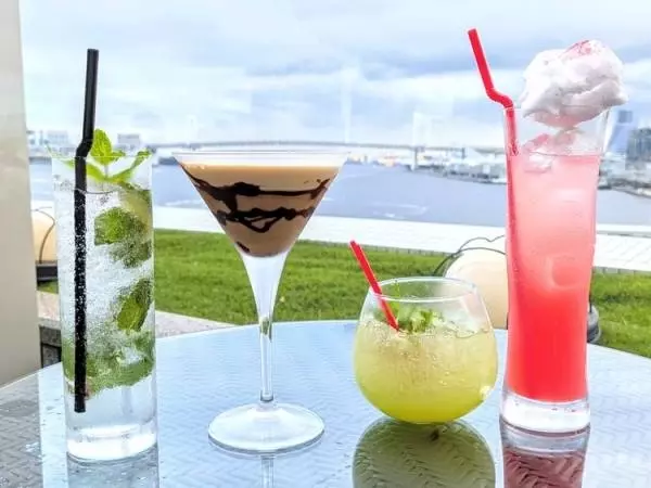 夏のテラスにぴったりなオリジナルモクテルも、自由に頼むことが可能です。左から順に『ヴァージンモヒート』『エスプレッソブリュレ』『キウイ ピリーニャ』『ピンク グレープモーニ』