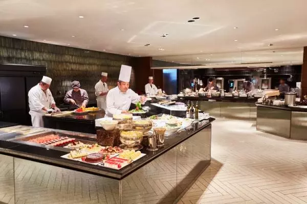 活気溢れるオープンキッチンスタイル。ブッフェの始まりには、バジルとチーズが香る『夏野菜とベーコンのスープ』をそれぞれのお席に用意してくださいます