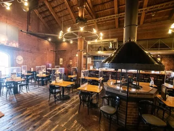 お店は谷地頭町の一角で創業。1988年に現在の金森赤レンガ倉庫に店を構えました。広々とした店内は天井が高く、太い檜の柱や、イギリス積みのレンガが印象的。レトロな雰囲気に包まれながら、こだわり抜いたビールが味わえます。テーブル席のほか、65名まで収容できる個室も完備。お一人様やカップルにオススメのカウンター席もあります。