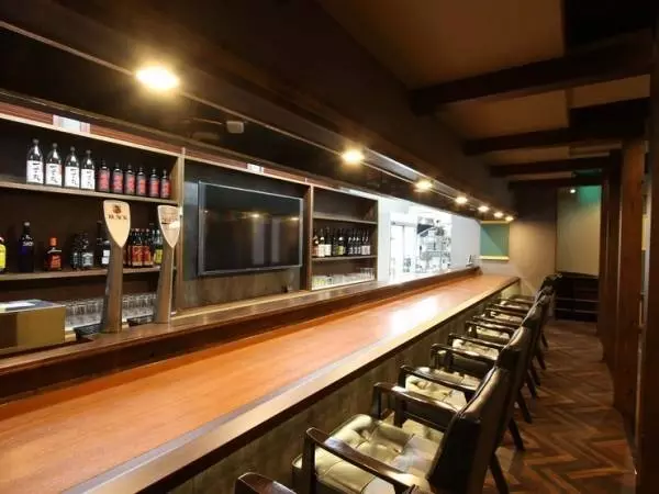 柔らかな照明が照らす店内にはジャズが流れ、シャンデリア風のワイングラスタワーが特徴的です。カウンター席、テーブル席に加えて、半個室風のソファ席を備えるほか、100インチの大型テレビもあり、貸し切りパーティーにもオススメ。