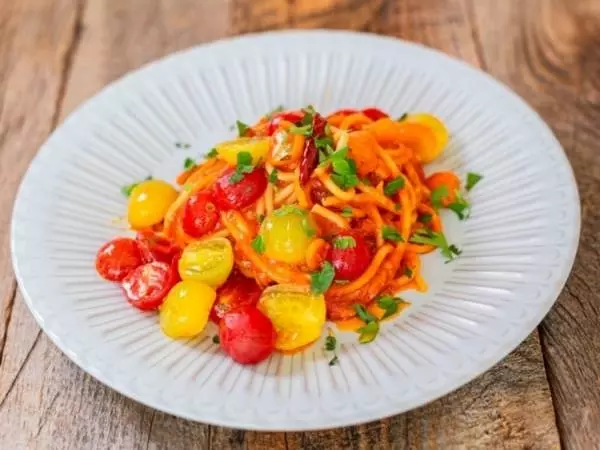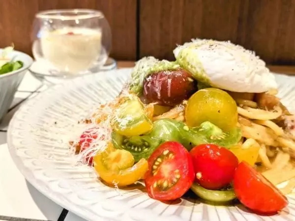 『たっぷりトマトのナポリタン』モチモチの生パスタを使用。たっぷりのお野菜とフレッシュ感のあるミニトマトのザクザクした食感が楽しめます。見た目も鮮やかな、今までにないNEOナポリタンです
