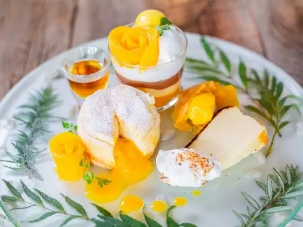 『デザートプレートセット』手作りスイーツの贅沢な盛合せ。バスクチーズケーキ、季節のバスクチーズケーキ、マンゴーのグラスパフェ、生チーズパンケーキ、もぎたてフルーツのジェラート。